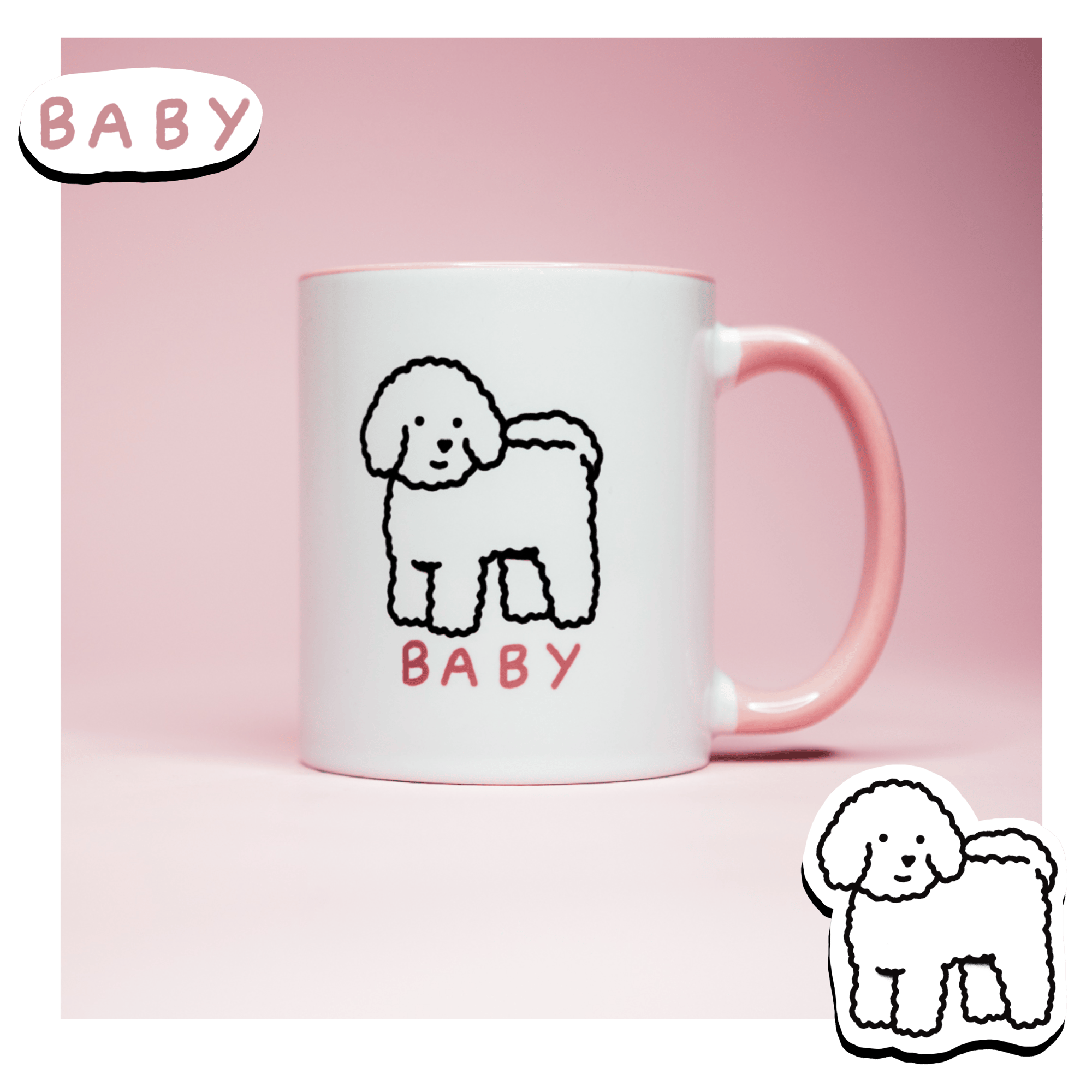 cute ceramic mug with double baby puppy print. featuring matching pink handle and interior. "baby" in the figurative sense, this mug is likely too heavy and dangerous for literal babies and their tiny hands