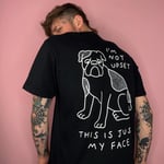 black heavyweight tee with FULL back print featuring a seemingly grumpy dog but he's actually doing okay that's just how his face looks 🐶 with text "IM NOT UPSET, THAT'S JUST MY FACE." also printed on the pocket there's a smaller version of the same design. all screen printed in white ink.