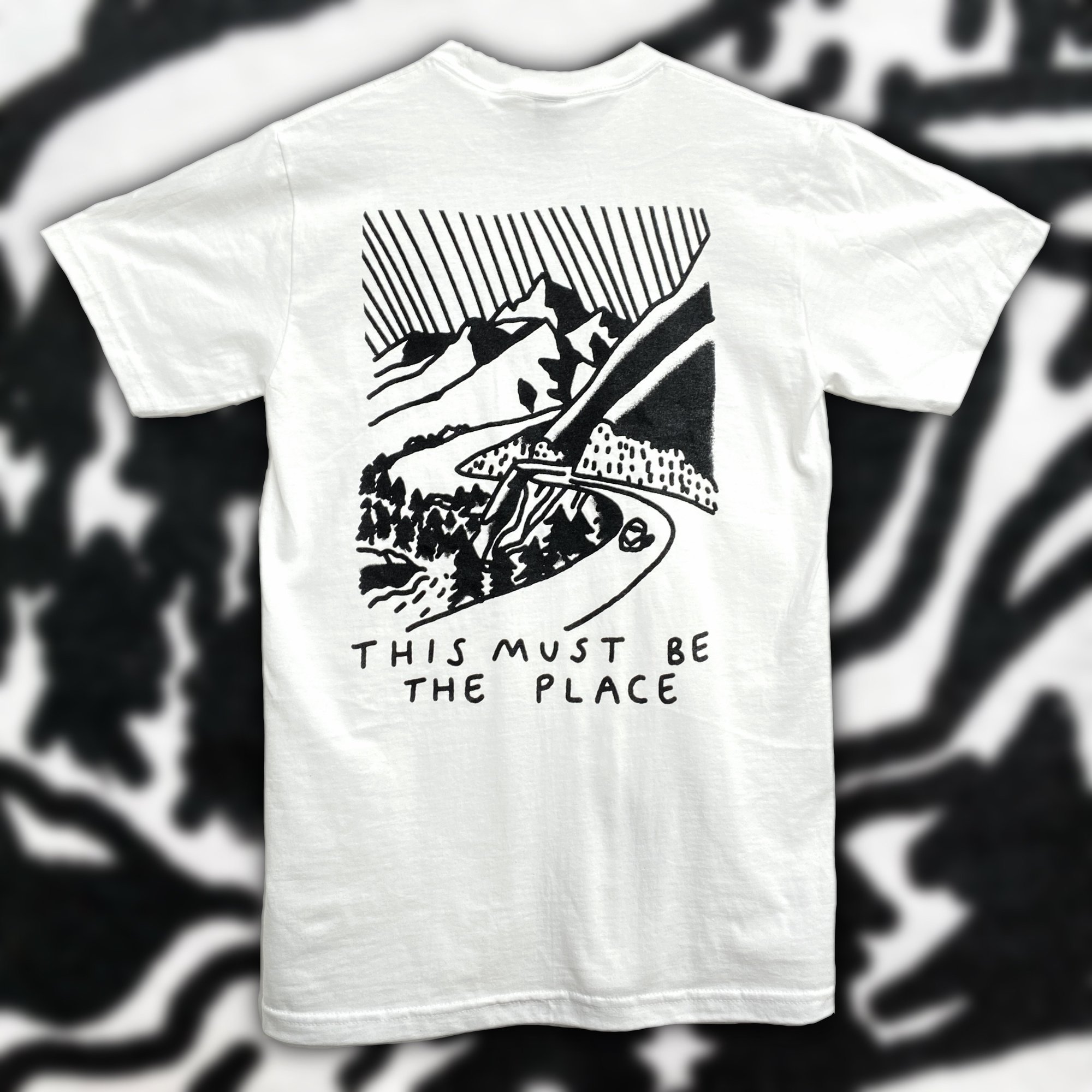 white heavyweight tee with FULL back print featuring a tiny car driving through a big lovely mountain range with text "THIS MUST BE THE PLACE." also printed on the front left pocket print there's a small square snapshot of the car with "LOVERAT" underneath.