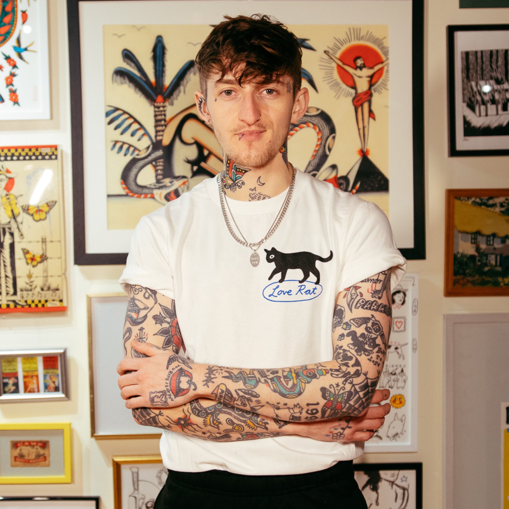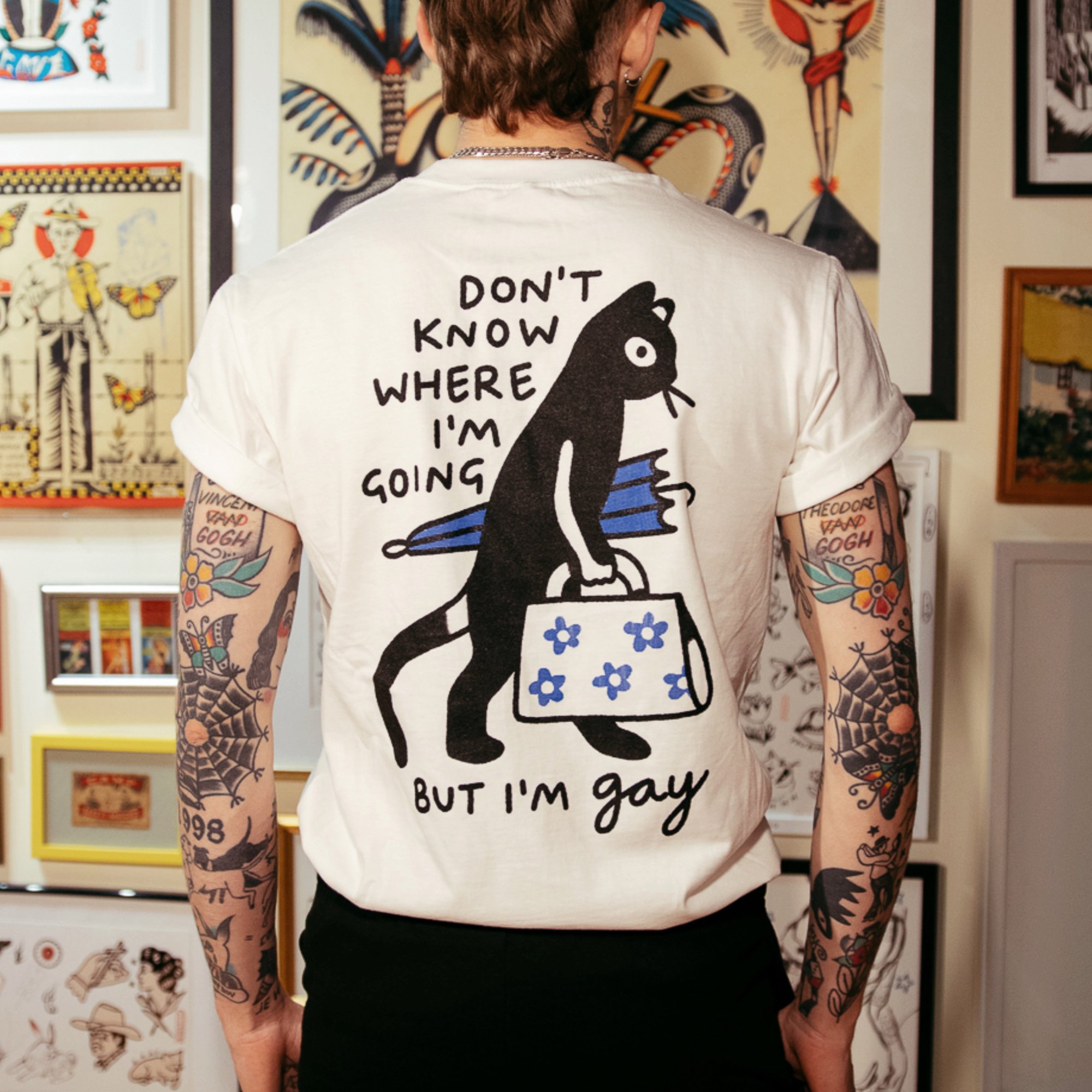 heavyweight tee with FULL back print featuring a cat holding a suitcase and umbrella, ready for an adventure. text reads " I don't know where I'm going, but I'm gay" also printed on the front left pocket print there's a small black cat, cursive text underneath reads"LOVERAT"